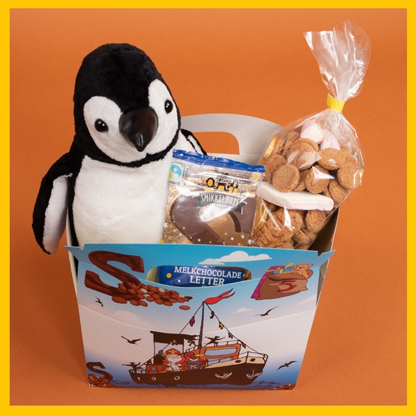 Deze mooi bedrukte Sinterklaas cadeaubox is een mooie aanvulling. Deze cadeauboxen kunnen gevuld worden geheel naar uw wensen. Zo kan er een chocoladeletter en een snoepzak in. Deze snoepzak is rijk gevuld met kruidnoten, taaitaai, suikerhartjes en chocolade munten. Als cadeau zit er ook een lieve knuffel in.